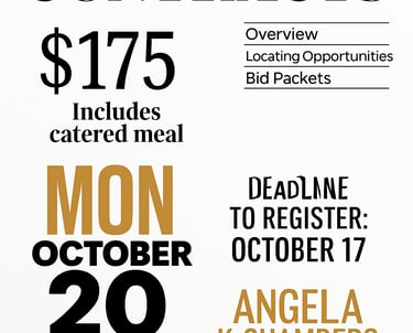 To educate, empower, and equip small business owners, women entrepreneurs, and minority-owned businesses with the tools, resources, and strategies needed to successfully find, bid, and win contracts.