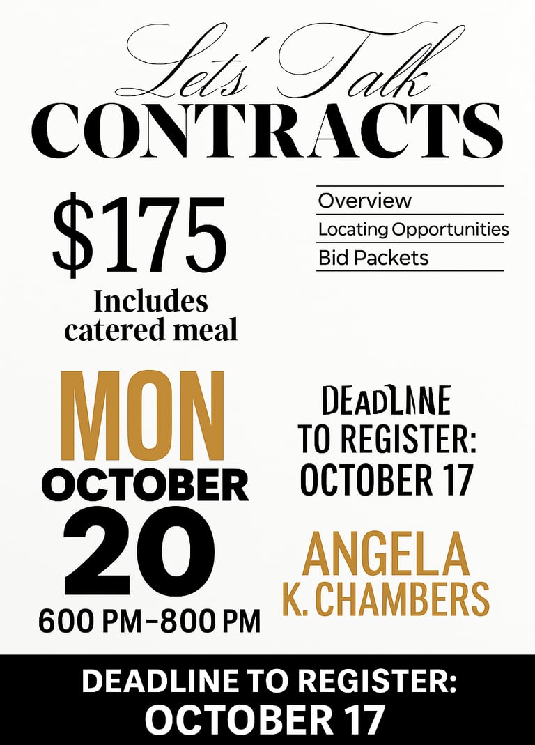 Let’s Talk Contracts LIVE meets monthly, offering fresh insight and new strategies every session. Participants who attend multiple sessions gain access to the Bids & Brilliance Alumni Circle, with ongoing opportunities, accountability, and networking.